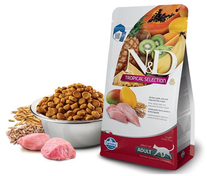 Opis proizvoda: Tropical Selection Chicken&Tropical fruits Adult Piletina, spelta, ovas i tropsko voće recept. Kompletna hrana za odrasle mačke.